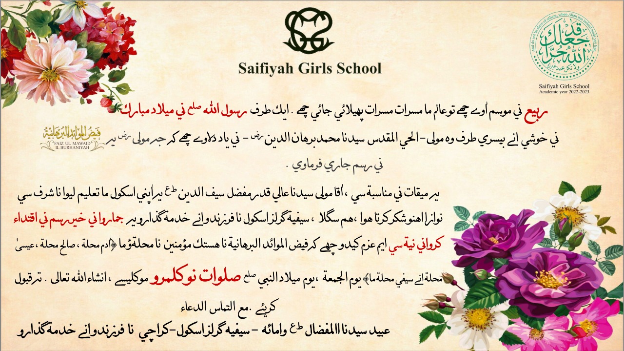 On the day of Milaad al-Nabi SAW, students of Saifiyah Girls School – Karachi performed khidmat of Kalamra in 4 mohallah of Karachi – Saifee Mohallah, Saleh Mohallah, Adam Mohallah and Essa Mohallah.