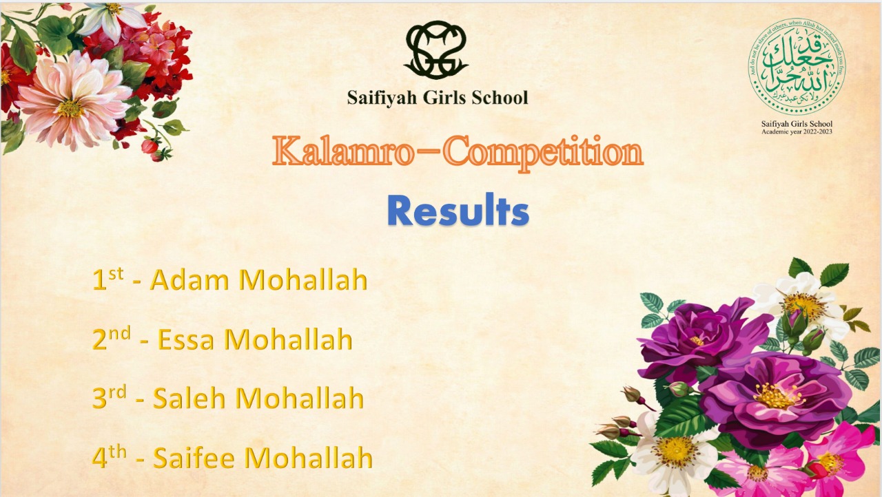 This was the second consecutive year Saifiyah Girls School students participated in performing Kalamra khidmat and holding the competition, inculcating the importance of performing various khidmat in Faizul Mawaidil Burhaniyah.