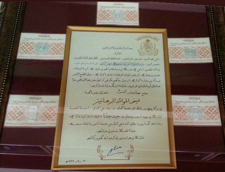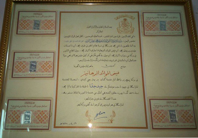 Shehzada Sahab DM then proceeded towards bestowing certificate to mawaze who were present. Those mawaze who had already been bestowed certificates were given hadiyah of silver coins. There were also mawaze who previously did not fulfill the criteria for the certificate, but through hard work and dedication had increased the standard for Faizul Mawaidil Burhaniyah and were eligible for the certificate. Ummaal Kiraam were guided towards framing these silver coins along with the certificate in the office.