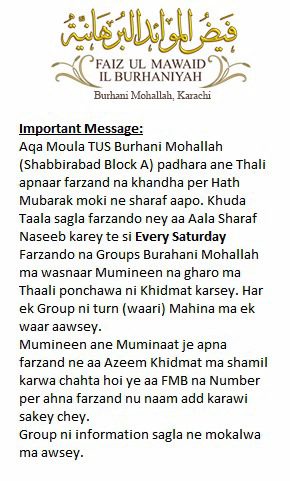 After being bestowed with such azeem sharaf Faizul Mawaidil Burhaniyah Committee took an initiative to urge children to participate in Thaali distribution on weekly basis. Making groups of 4 every group will get the sharaf of delivering Thaali once a month on every Saturday.