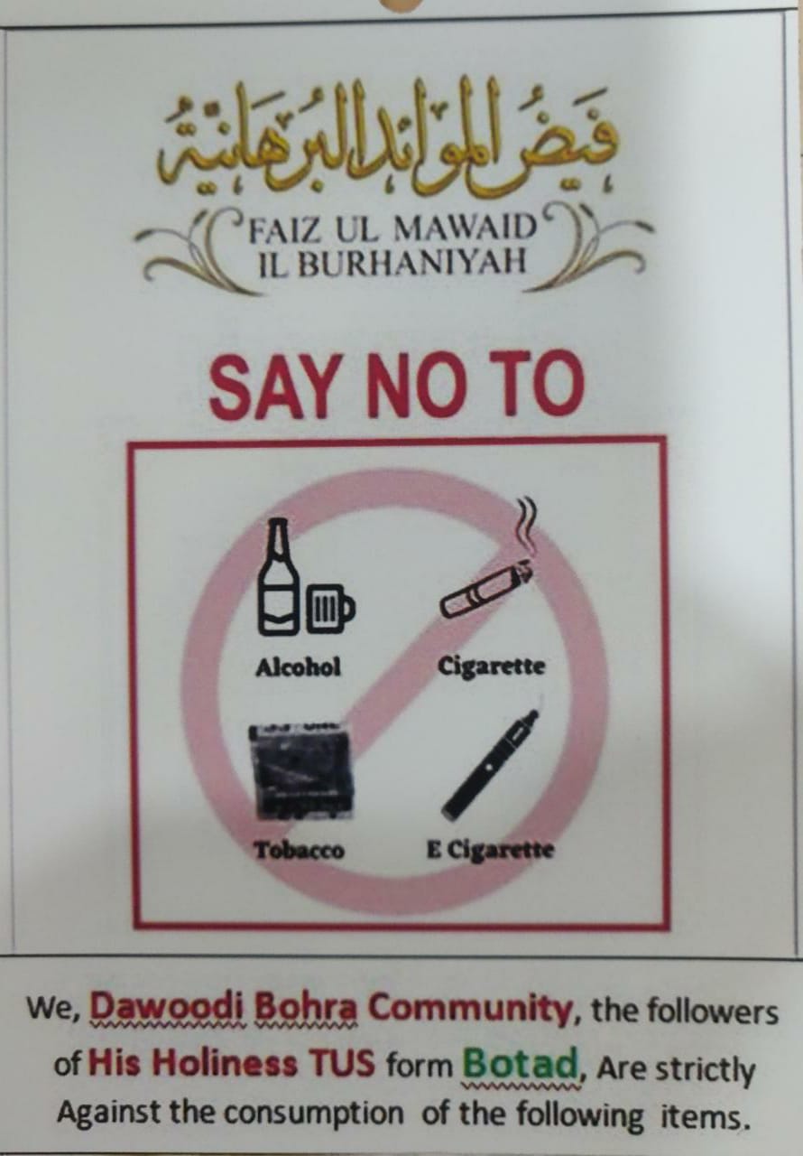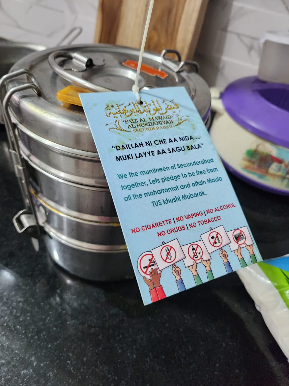 Placards sent in thaali for awareness and prevention from moharramaat as per Irshaad-e-Munir of Huzurala TUS