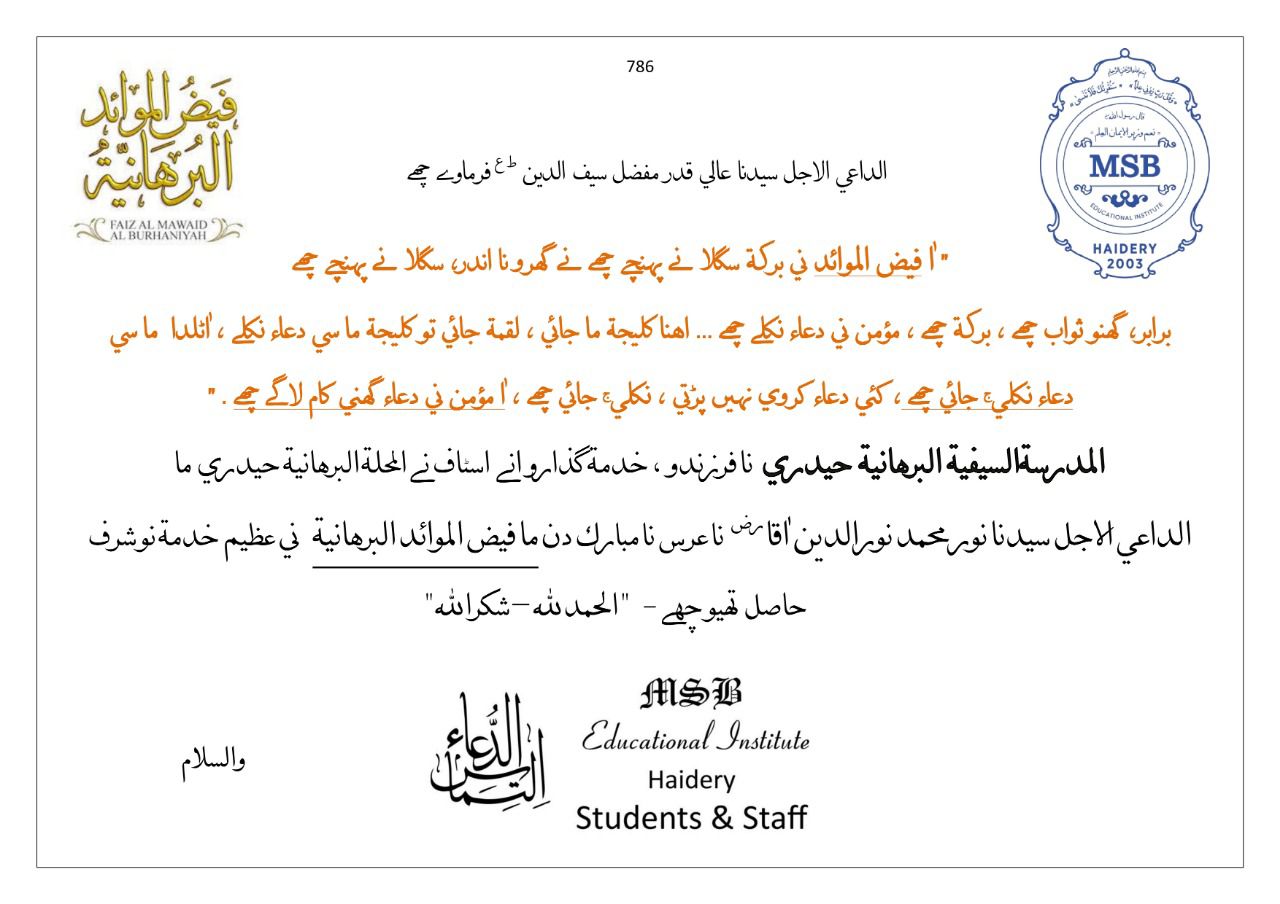 Faizul Mawaidil Burhaniyah Hadiyah bestowed from Huzurala TUS distributed to mumineen