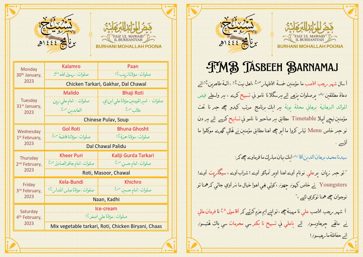 Tasbeeh Barnamaj in thaali. Each day Tasbeeh recitation on Awliyah Kiraam AS, with special menu.