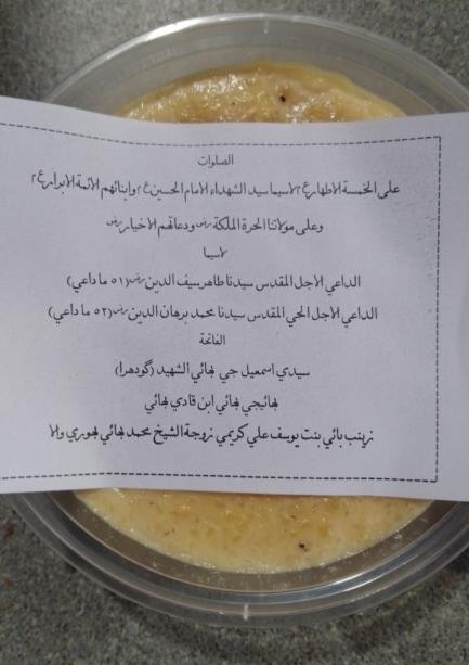 Fateha kheer by Shk Mohammed Bhai Bhuriwala for sawab of her wife Zainab bhen in 4 mohallah of Karachi; Al-Mahalat Al-Burhaniyah, Essa Mohallah, Burhani Bagh and Ibrahim Mohallah