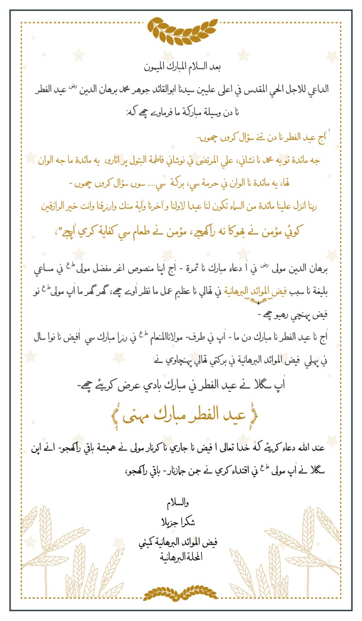 Faizul Mawaidil Burhaniyah thaali barakaat started from Eidul Fitr. Eid tahaani card was also sent in the mauze.