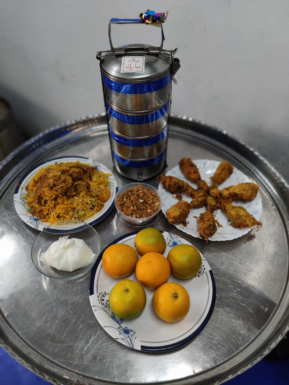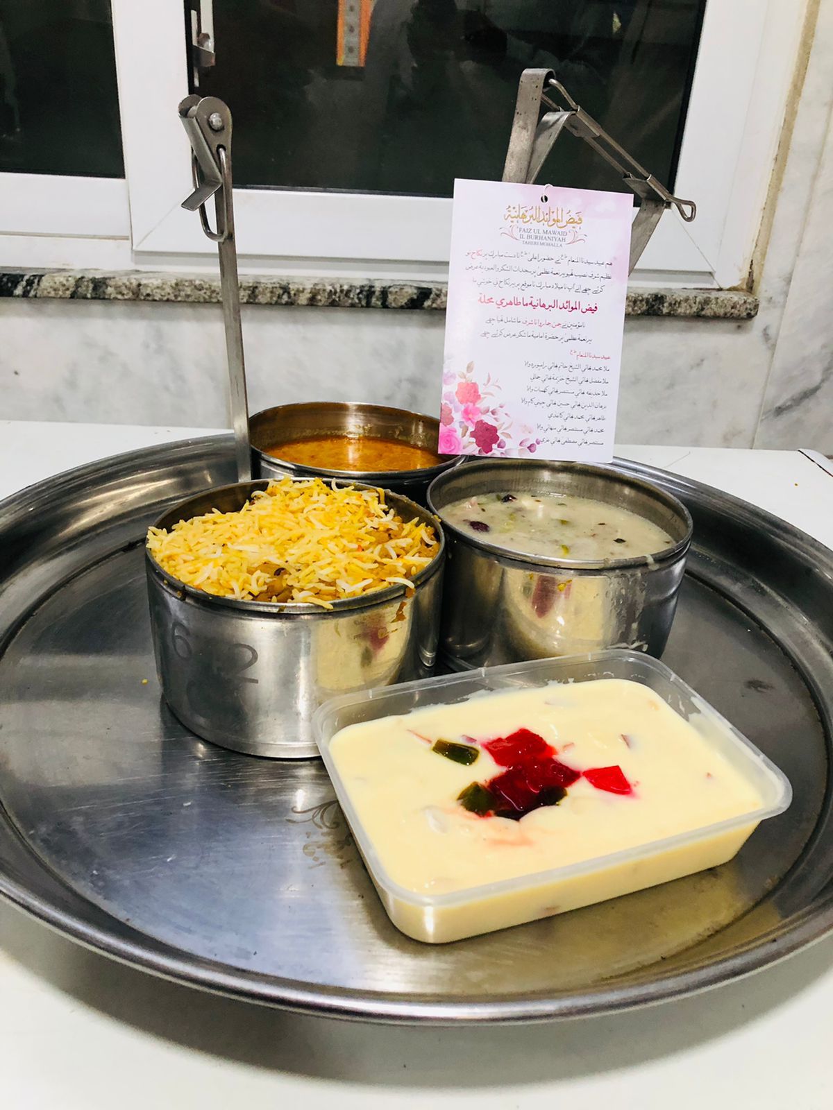 Decorated thaali sent on Milaad Mubarak of Al-Dai Al-Ajal Syedna Mohammed Burhanuddin RA and Al-Dai Al-Ajal Syedna Aaliqadr Mufaddal Saifuddin TUS
