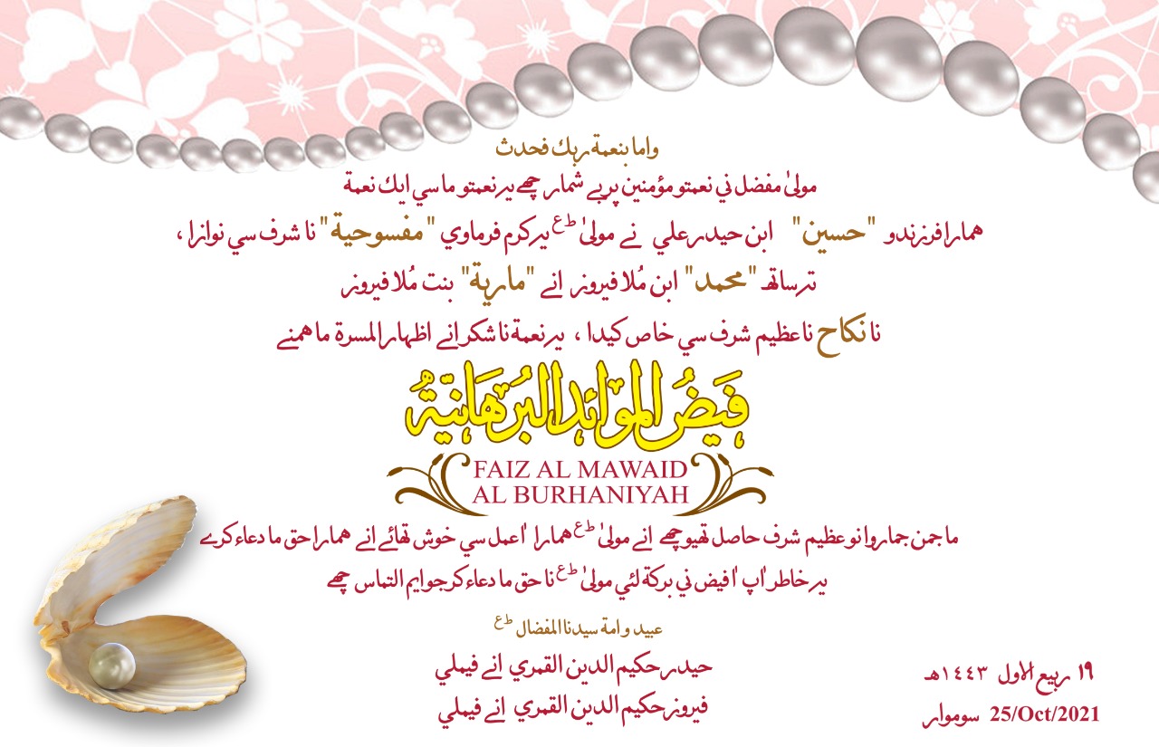Faizul Mawaidil Burhaniyah Niyaaz by Husain Bhai Mithaiwala on shukr of Ziyafat of Huzurala TUS during Safar Mubarak to Karachi and misaaq of his daughter