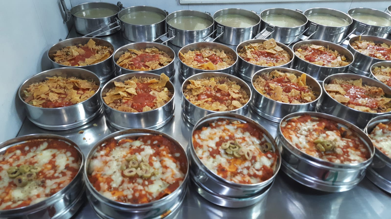 Mexican cuisine with Baked Enchiladas, Mexican Rice and Onion Soup sent in thaali