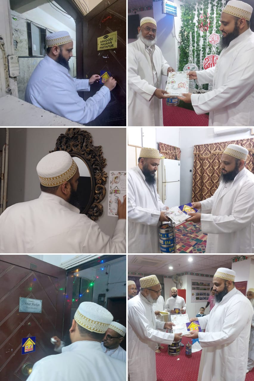 Placards sent in thaali for awareness and prevention from moharramaat as per Irshaad-e-Munir of Huzurala TUS. Aamil Sahab and members also participated in thaali distribution to spread more awareness.