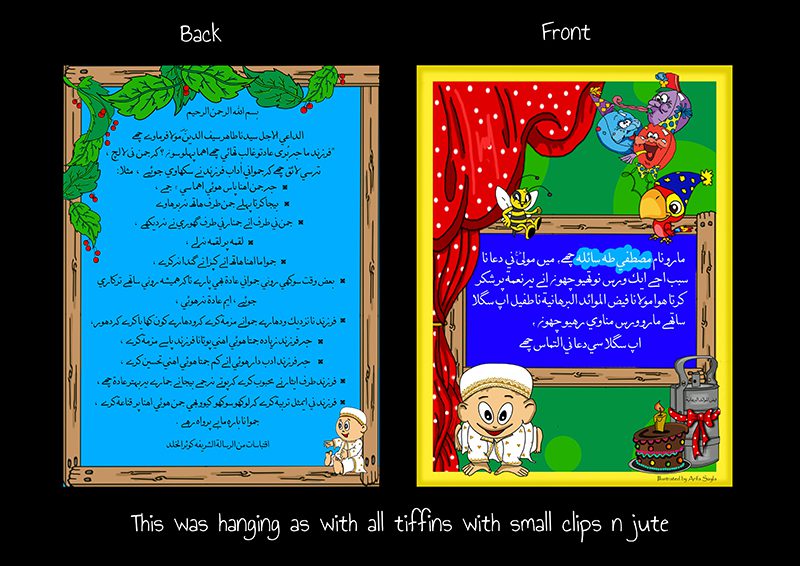 Despite getting several negative feedbacks on the idea, my husband was more determined than me to go ahead as we also wanted to set an example of a simple celebration. And finally when the day of birthday came, we beautifully decorated the thaalis, wrapped balloons around it and every house in Rawalpindi/Islamabad got a piece of cake in their thaalis to join in our celebrations. We were truly honored when Shehzada Syedi Taha BS Saifuddin DM did the zikr of this unique thaali in Rawalpindi during Waaz Mubarak in Surat. The idea clicked so much that I even got the sharaf of designing Mufaddal Maula’s TUS grandson’s birthday, which was also celebrated through Faizul Mawaidil Burhaniya in India.